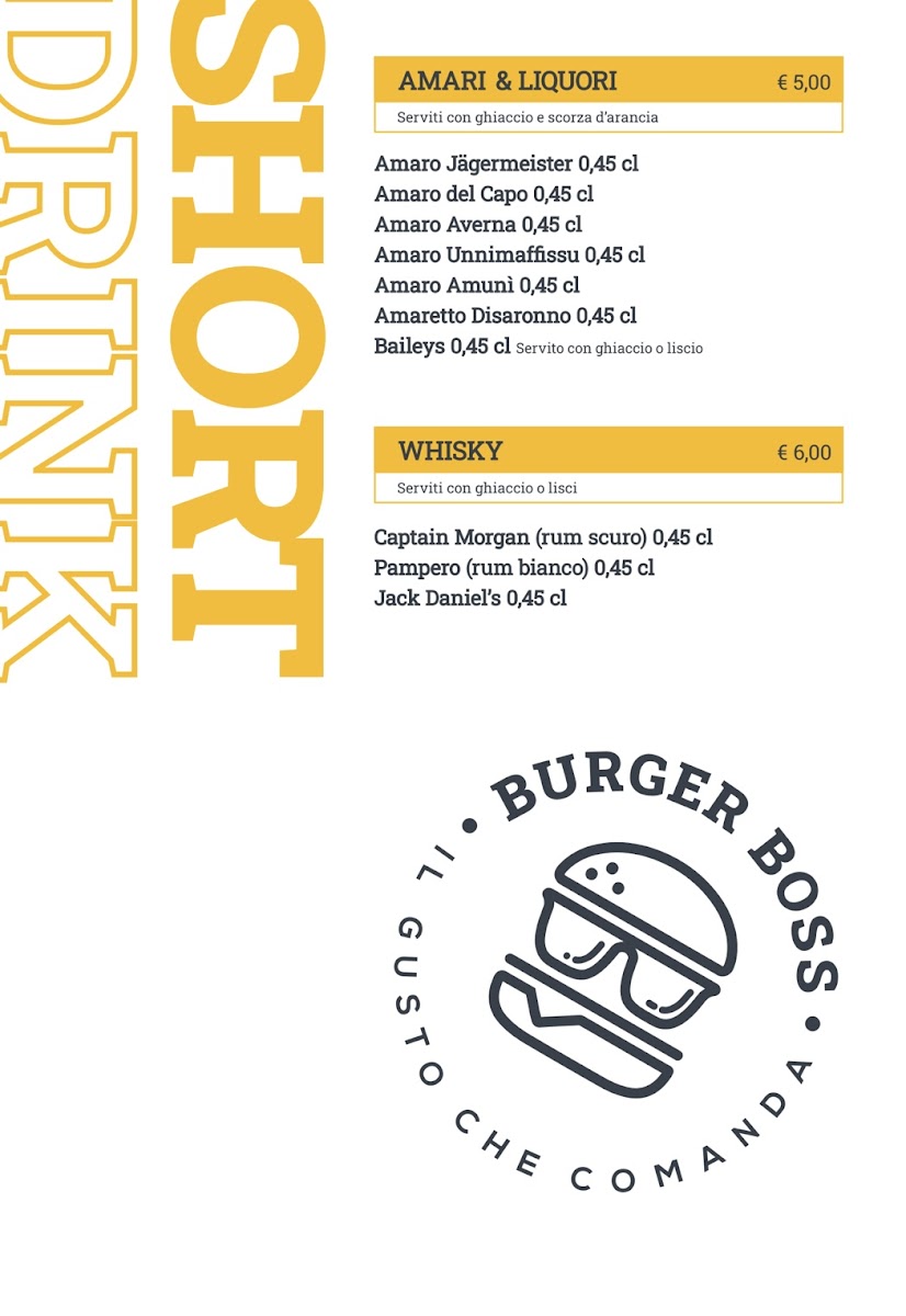 Doppio hamburger 150 g ciascuno, insalata lattughino, doppio bacon croccante, doppio cheddar, uovo fritto, cipolla caramellata e salsa "Boss". Contorno di patatine, salsa e bevanda in lattina da 33 cl.